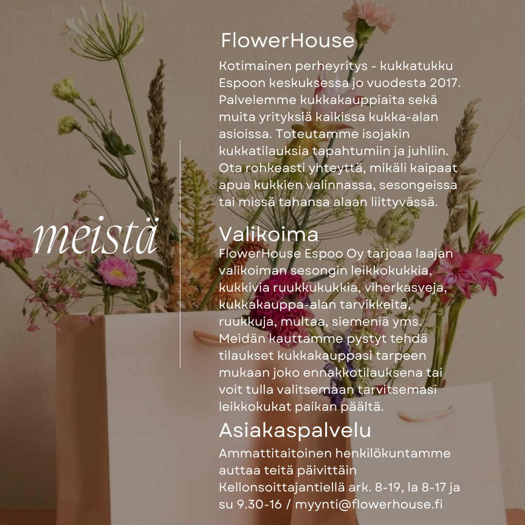 kukkatukku ja vähittäismyymälä avoinna päivittäin: